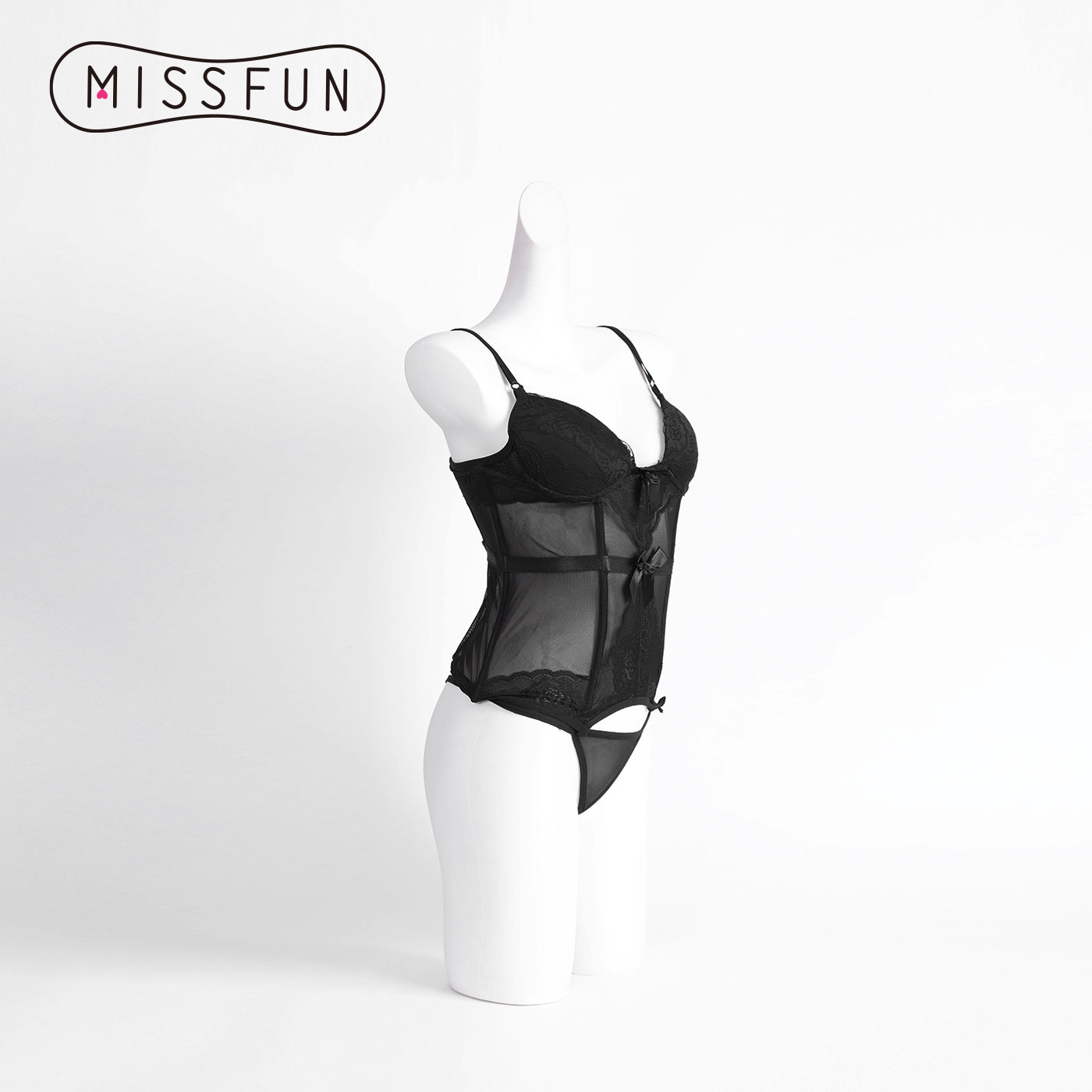 This elegant black two-piece lingerie set blends romance and seduction for unforgettable nights. The corset-style top features delicate lace cups, supportive underwire, and sheer mesh panels, with adjustable straps for a tailored fit. A satin bow detail adds a playful touch, while the matching thong completes the look. Designed to flatter your figure and boost confidence, it’s perfect for special occasions or treating yourself to a little luxury.
